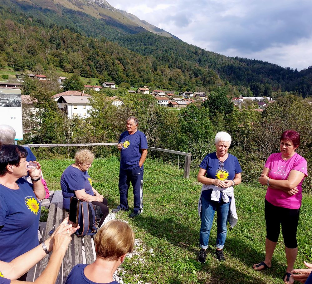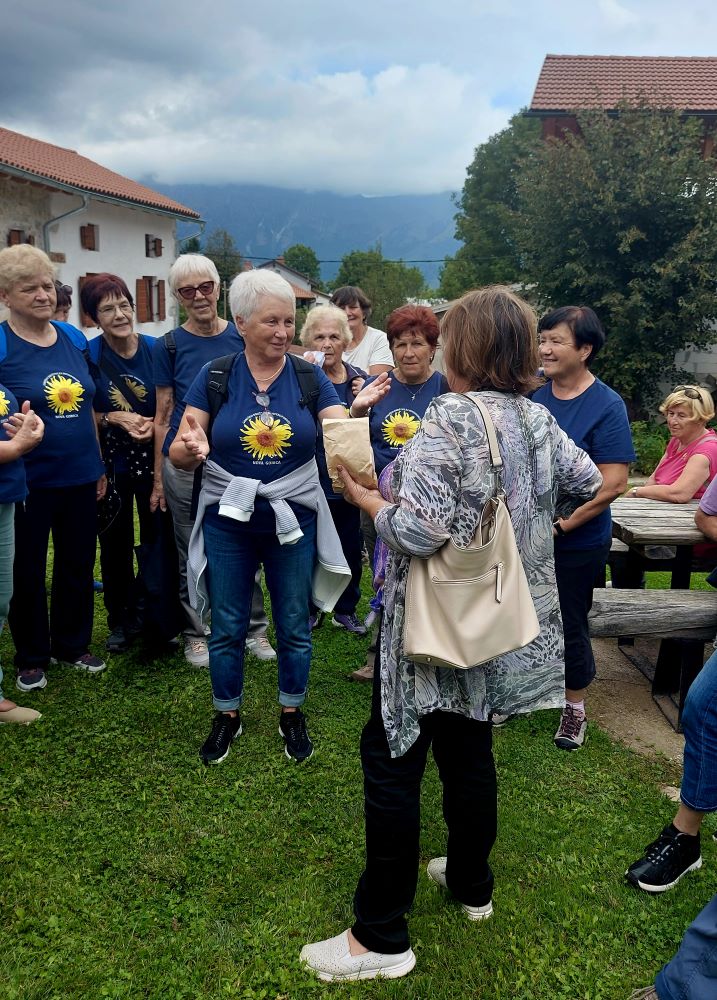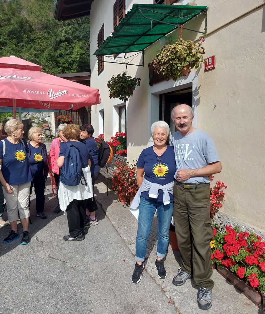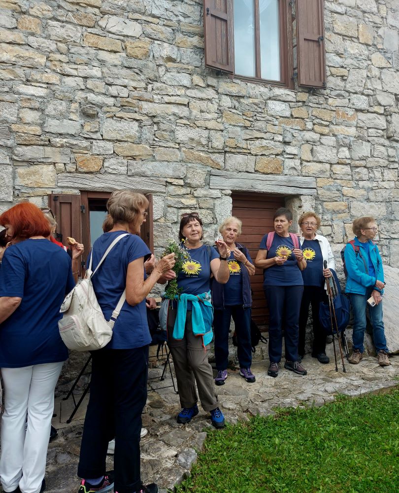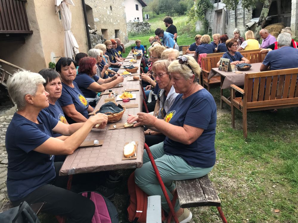 Sledila je vožnja, kar zahtevna, a zahvaljujoč našim preizkušenim voznikom in predvsem voznicam, smo srečno prispeli v Robidišče, to najbolj zahodno vas ob slovensko italijanski meji. Stoletja je bila organsko vezana na Benečijo, od katere jo je leta 1947 ločila novo postavljena meja z Italijo. Posledica je bilo izseljevanje in zamiranje vasi. Dodatno jo je prizadel potres 1976, ki je povsem spremenil njeno obličje, a popotresna obnova je vendar ohranila njeno vaško pristnost in beneško arhitekturo. Naša gostiteljica je bila učiteljica Vida Škvor. Šole že dolgo ni več, a iz njenega pripovedovanja je velo pričakujoče navdušenje, razbrati je bilo moč neuklonjivo voljo, da na vse načine ohranijo to vas, pa čeprav je v njej le 12 stalnih prebivalcev. Imajo tudi lepo urejeno domačijo Škvor, ki privablja veliko obiskovalcev, in manjši muzej. V tem enkratnem okolju smo tokrat ob rojstnem dnevu nazdravili Dragici in ji poklonili šopek gorskega cvetja z nadmorske višine šeststoenainsedemdesetih metrov.