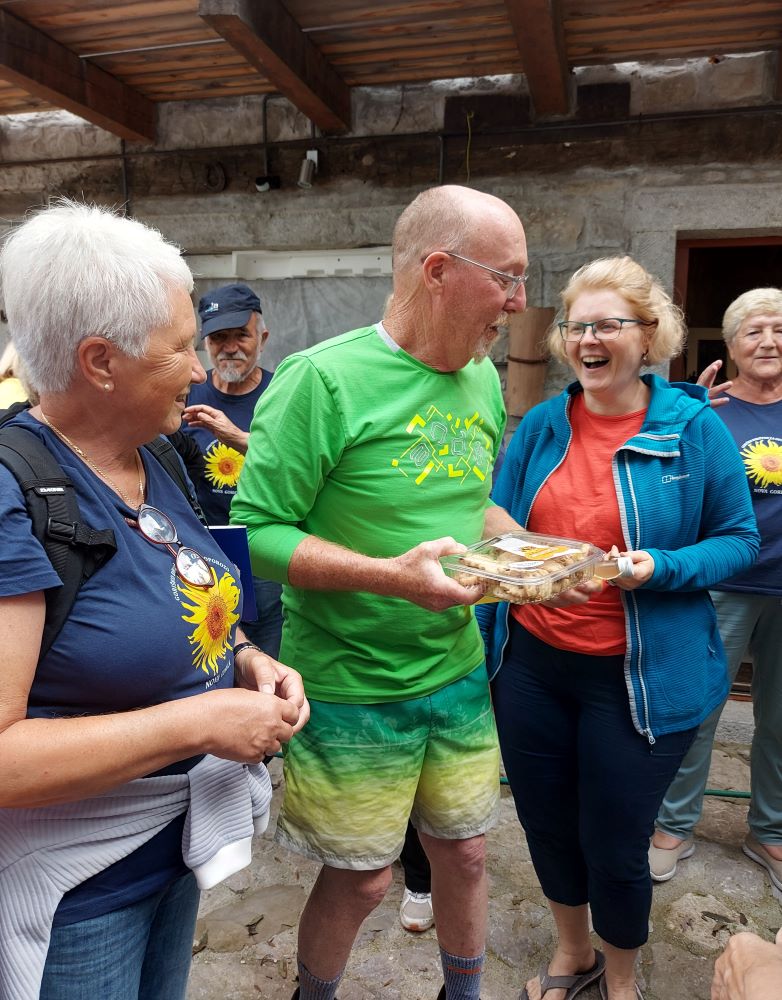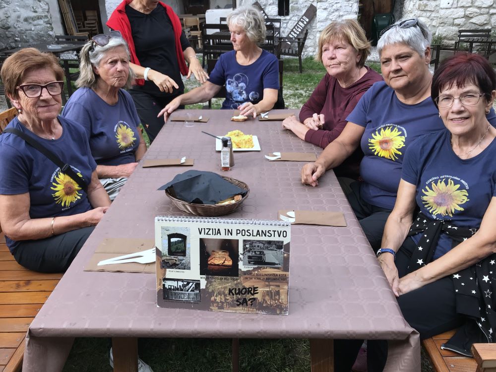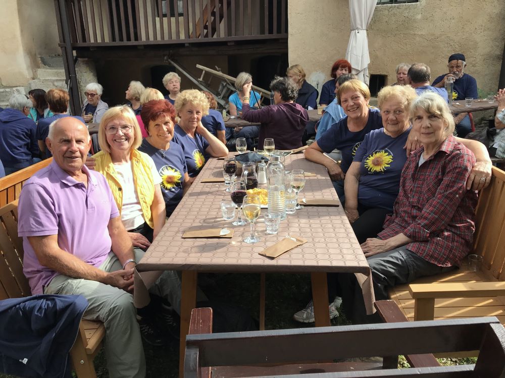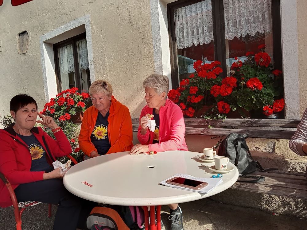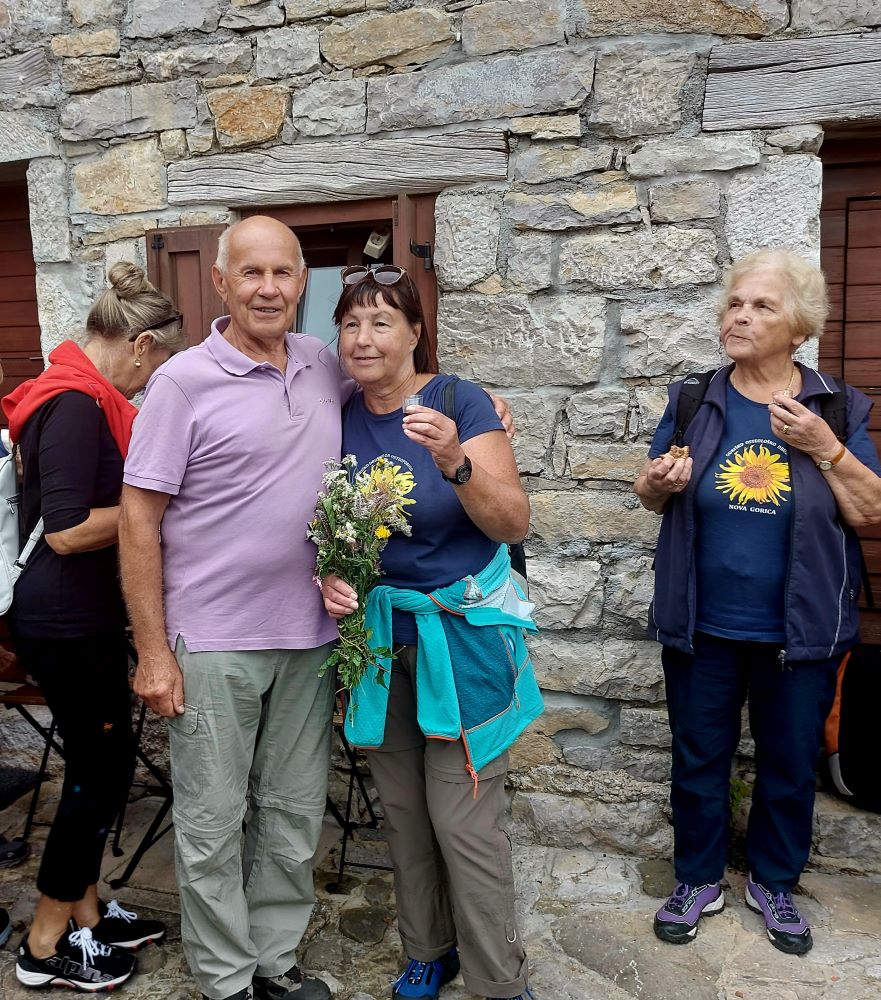Sledila je vožnja, kar zahtevna, a zahvaljujoč našim preizkušenim voznikom in predvsem voznicam, smo srečno prispeli v Robidišče, to najbolj zahodno vas ob slovensko italijanski meji. Stoletja je bila organsko vezana na Benečijo, od katere jo je leta 1947 ločila novo postavljena meja z Italijo. Posledica je bilo izseljevanje in zamiranje vasi. Dodatno jo je prizadel potres 1976, ki je povsem spremenil njeno obličje, a popotresna obnova je vendar ohranila njeno vaško pristnost in beneško arhitekturo. Naša gostiteljica je bila učiteljica Vida Škvor. Šole že dolgo ni več, a iz njenega pripovedovanja je velo pričakujoče navdušenje, razbrati je bilo moč neuklonjivo voljo, da na vse načine ohranijo to vas, pa čeprav je v njej le 12 stalnih prebivalcev. Imajo tudi lepo urejeno domačijo Škvor, ki privablja veliko obiskovalcev, in manjši muzej. V tem enkratnem okolju smo tokrat ob rojstnem dnevu nazdravili Dragici in ji poklonili šopek gorskega cvetja z nadmorske višine šeststoenainsedemdesetih metrov.