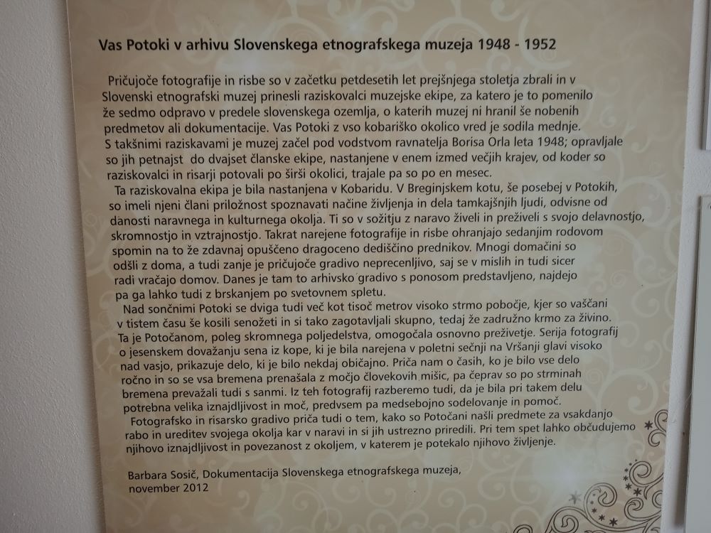 Po Soški dolini, do Kobarida, nato skozi Staro selo do prvega postanka v vasi Potoki. V družbi in ob pripovedi domačina Iva Lavrenčiča smo si ogledali vaški muzej, kjer fotografije z razstave Slovenskega etnografskega muzeja iz let 1951 in razstavljeni predmeti prikazujejo življenje teh krajev. Naš gostitelj nas je posebej opozoril na eksponate, ki se navezujejo na tod prisotno staroverstvo, kot sta kamniti glavi božanstva Belina in njegove žene, pa posebna energetska palica in še marsikaj drugega.