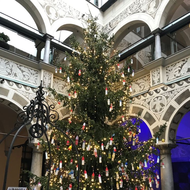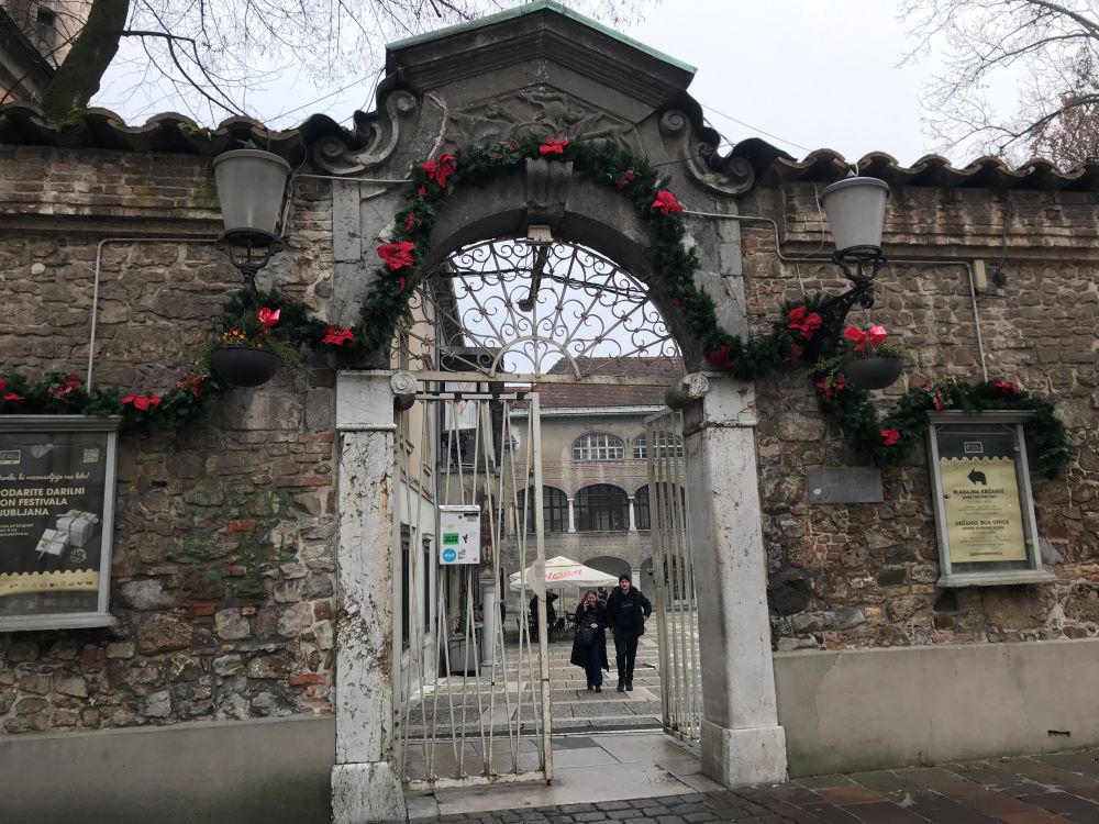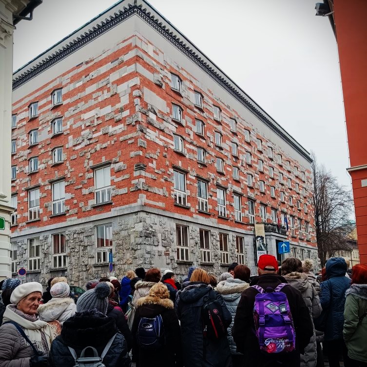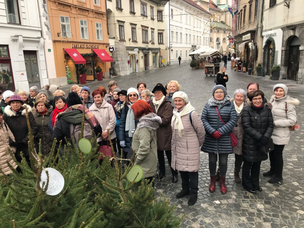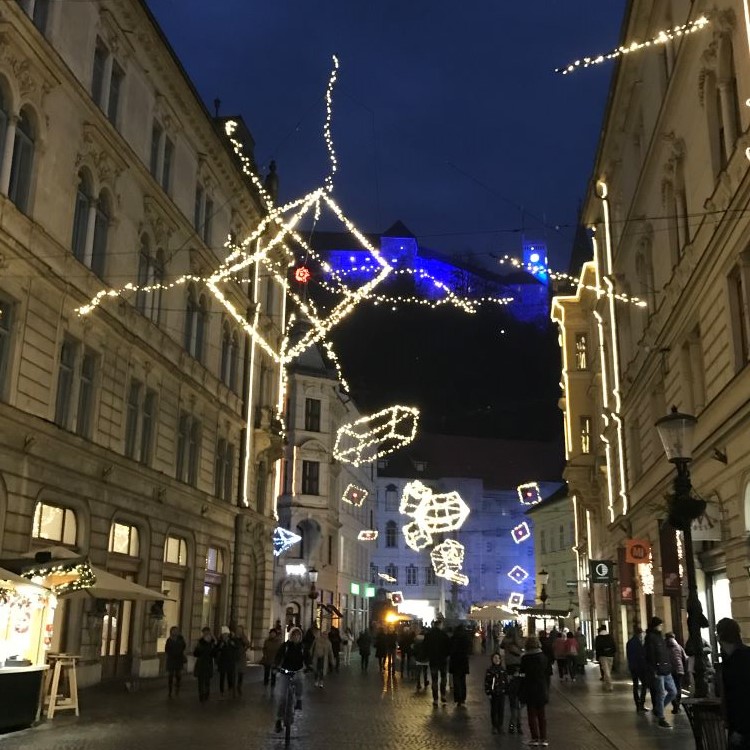 Pot, ki vodi mimo slikovito oblikovanega brega Ljubljanice, s pokrito tržnico, mimo tromostovja, čez Šuštarski most, do impozantne stavbe Narodne univerzitetne knjižnice in dalje Križank (vse Plečnikove stvaritve), smo zaključili v centru mesta, kjer smo doživeli magično božično-novoletno razsvetljeno Ljubljano.